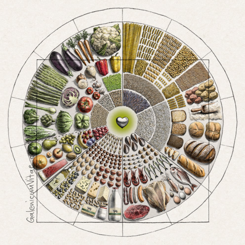 The Healthy Plate is divided into five sections that correspond to the five major food groups. The size of each group within the circle indicates the ideal ratio we should choose from among the different groups. Five parts are for cereals, rice, potatoes and pasta. Two parts are for meat, fish and eggs. There are two parts for dairy products, oils and nuts. One part is for fruits and four more are for vegetables and legumes.